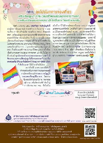-- ททท. ลุยโปรโมทการท่องเที่ยว เตรียมรับกฎหมายจดทะเบียนคู่ชีวิตของกลุ่มหลากหลายทางเพศ ภาคประชาสังคมห่วงร่างกฎหมายให้สิทธิไม่เท่าเทียมคู่รักชายหญิง.